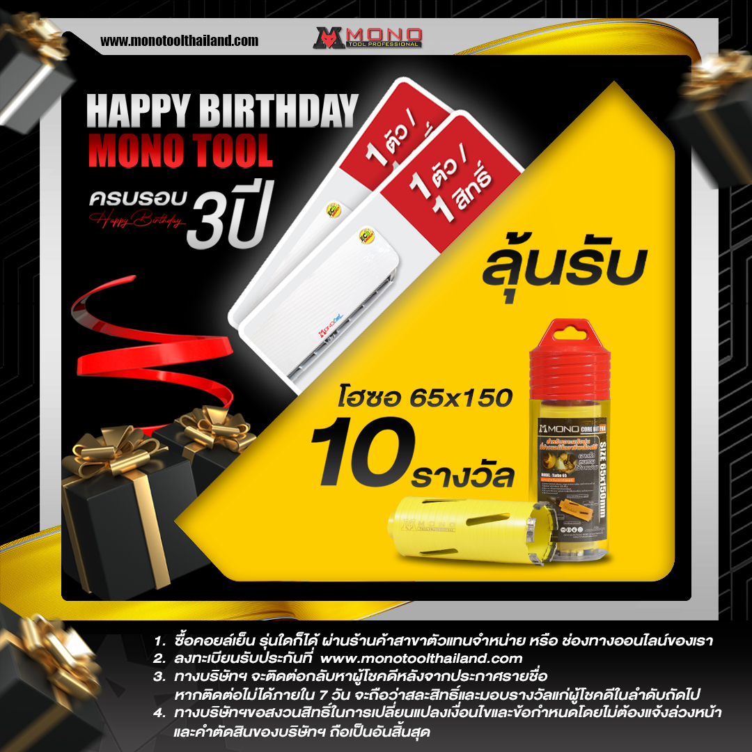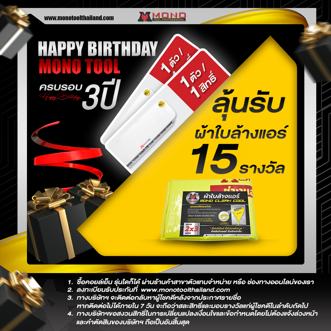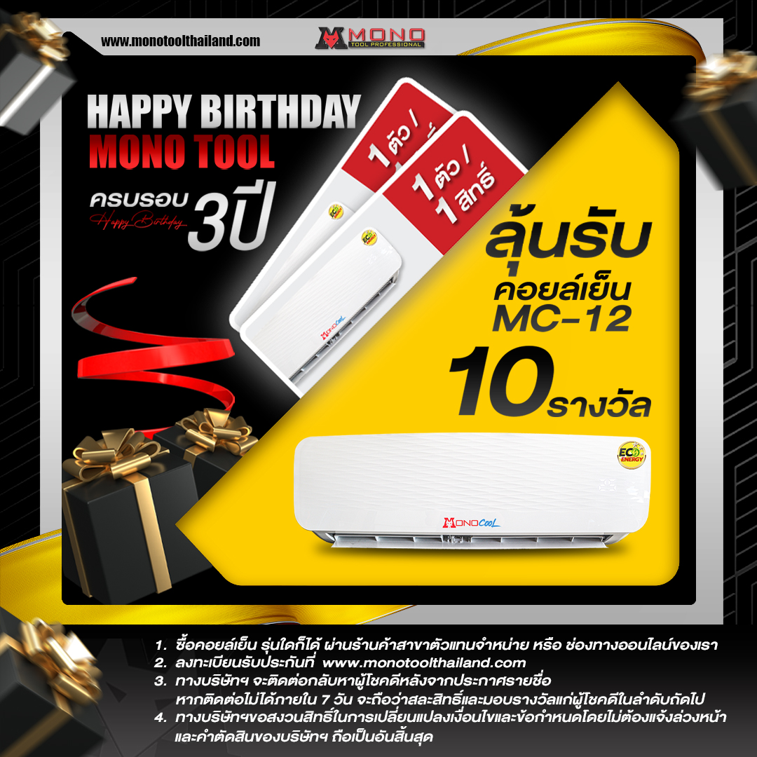 ครบรอบ 3 ปี MONOCOOL แจกครั้งยิ่งใหญ่ ลุ้นรับรางวัลสุดพิเศษ มากกว่า 33 รางวัล เพียงพี่ช่างติดตั้งคอยล์เย็นMONOCOOL รุ่นใด ขนาดใด ก็ได้ และ ลงทะเบียนรับประกันสินค้าผ่านช่องทาง www.monotoolthailand.com หรือสามารถ แสกนคิวอาร์โค้ดลงทะเบียนรับประกันได้ตรงที่ข้างกล่องคอยล์เย็นของทุกรุ่น พี่ช่างยิ่งติดมาก ยิ่งมีสิทธิ์มาก แต่อย่าลืมลงทะเบียนรับประกันสินค้าด้วยนะคะ โปรโมชั่นเริ่มตั้งแต่วันนี้ - 30 ธันวาคม 2566 นี้ และประกาศผลรางวัล วันที่ 5 มรกราคม 2567 ผ่านช่องทางเว็ปไซต์หรือหน้าเพจ MONOTOOL