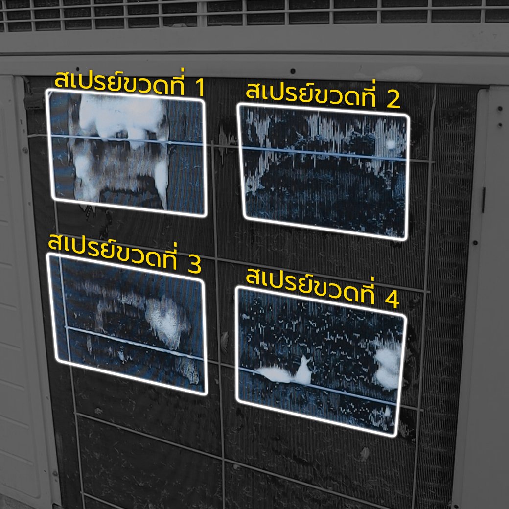 ตอนนี้ผมจะทดลองฉีดสเปย์โฟมลงบนคอยล์ร้อนกันนะครับ ไม่ว่าจะคอยล์เย็นหรือคอยล์ร้อนก็สามารถฉีดสเปรย์โฟมได้นะครับ ผมจะเอาน้ำยาสี่ตัวนี้ ฉีดลงไปในสี่ตําแหน่งนะครับทิ้งไว้สัก 5 นาที แล้วมาดูกันนะครับว่ามันจะเกิดปฏิกิริยายังไงบ้าง