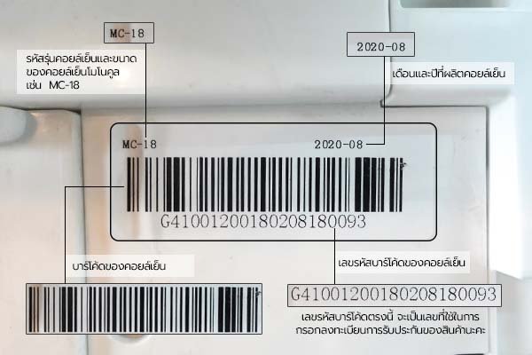 4.เลขรหัสบาร์โค้ดของคอยล์เย็น เลขรหัสบาร์โค้ดตรงนี้ จะเป็นเลขที่ใช้ในการกรอกลงทะเบียนการรับประกันของสินค้านะคะ