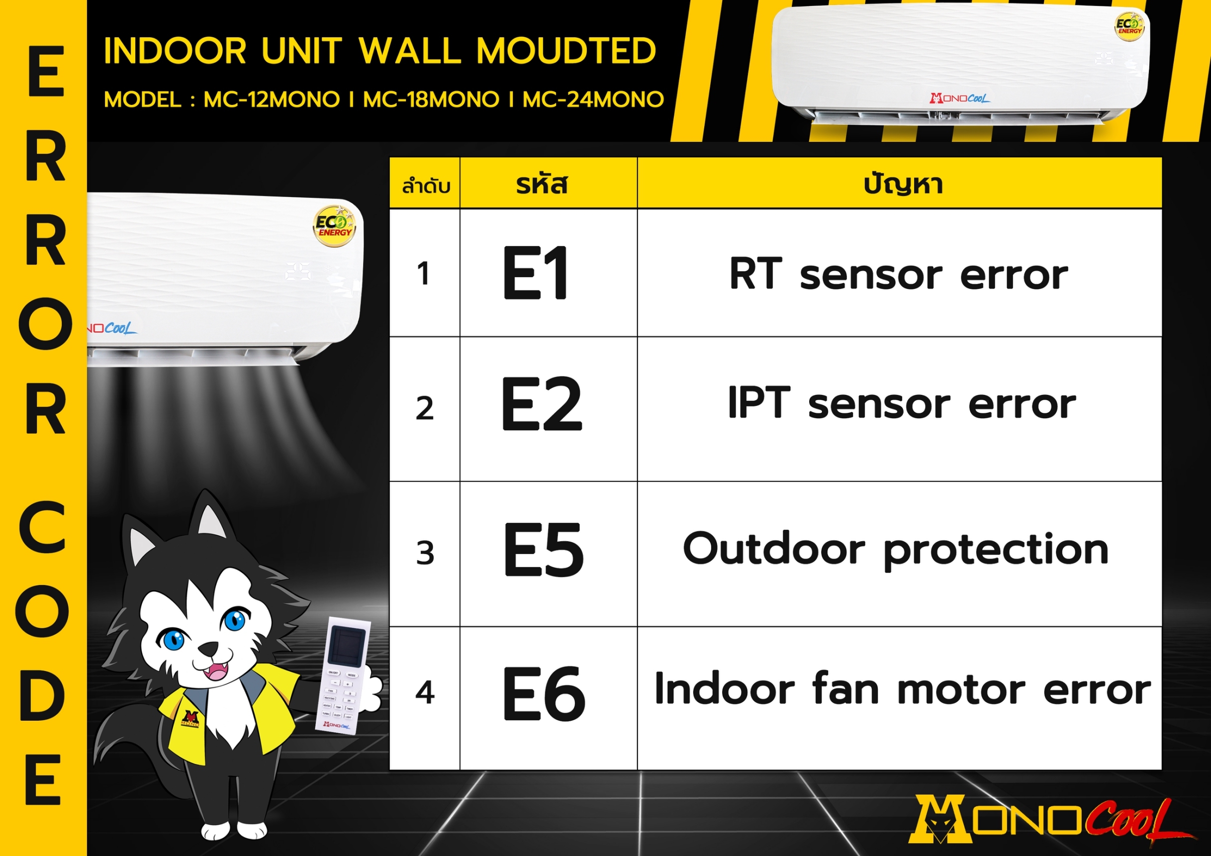 Error Code หรือ โค้ดตรวจสอบปัญหา เป็นรหัสที่กำหนดไว้ เพื่อบ่งบอกข้อผิดพลาดต่างๆของคอยล์เย็นหรือเครื่องปรับอากาศ ว่าเป็นข้อผิดพลาดจากสาเหตุใด โดยจะแสดงขึ้นบนหน้าจอ Display บนตัวเครื่อง เมื่อเครื่องปรับอากาศขึ้น Error Code ให้ทำตามคำแนะนำในคู่มือ โดยวิเคราะห์หาสาเหตุและอาการเสียเบื้องต้นจากคำแนะนำในคู่มือ Error Code หากไม่สามารถแก้ไขปัญหาจากคำแนะนำในคู่มือได้ ให้ติดต่อมายังศูนย์บริการเพื่อขอคำปรึกษาจากช่างเทคนิค